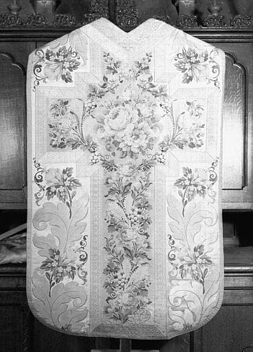 chape (10) ; dalmatique (4) ; chasuble (2) ; manipule ; étole de clerc ; voile de calice ; bourse de corporal