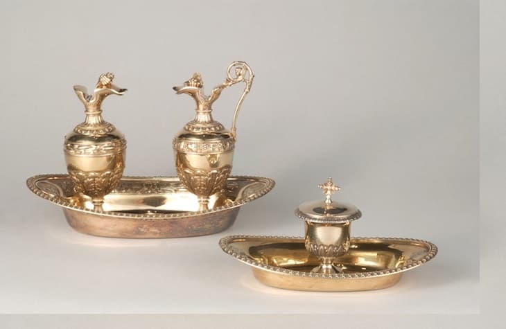 plateau à burettes ; burettes ; ampoule aux saintes huiles ; plateau ; bougeoir ; clochette d'autel