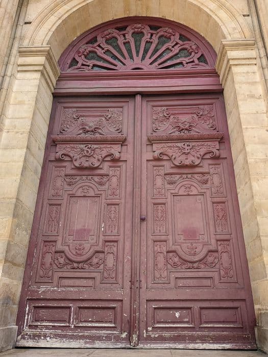 Grande porte à deux vantaux, ornée de panneaux à moulures et d'enroulements. Deux portes plus petites offrant la même décoration, situées de chaque côté de la porte principale.