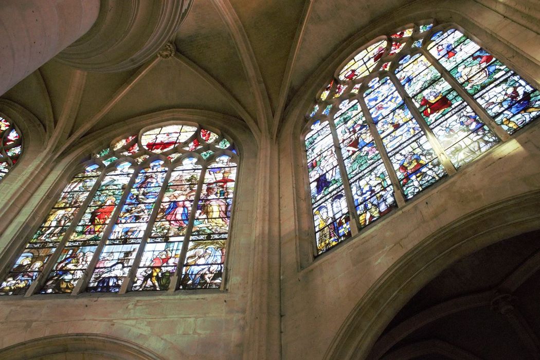 verrière du bas-côté gauche : Le Baptême du Christ, La Transfiguration, Le Martyre de saint Etienne, Portrait d'un chanoine de Sainte-Geneviève en donateur, La Trinité