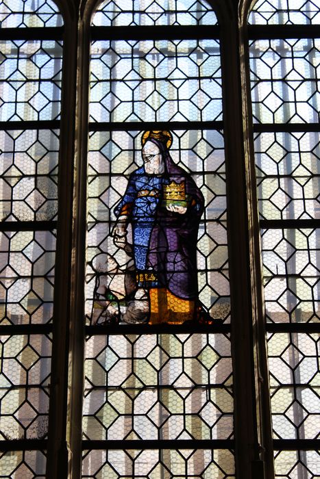 Le Christ en croix, vitrail en grisaille exécuté vers 1570. La Vierge de Pitié, médaillon exécuté vers 1550. Anciennement datée du 17e siècle.