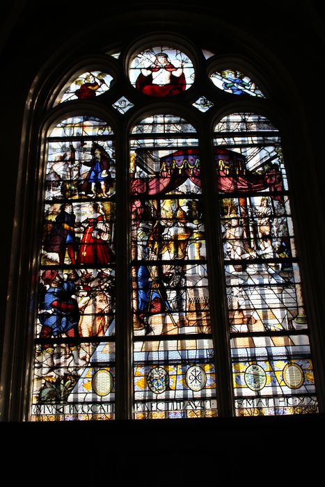 A gauche, les conviés qui ne veulent pas venir à la noce sont occupés à divers travaux, le Père éternel, sous un dais, distribue aux conviés le sang de Jésus Christ, dans le bas, les armes de la Présidente de Viole, donatrice ; au-dessus trois médaillons représentant un Ecce Homo et deux anges. Verrière en 3 compartiments.