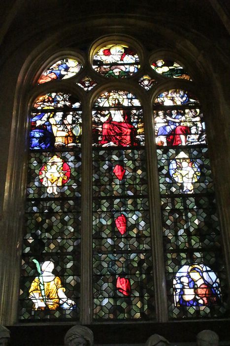 verrière de la chapelle de la Mise au tombeau : Le Christ du Jugement dernier, La Vierge à l'Enfant et deux anges musiciens