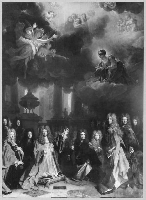 Fonctions combinées. Les portraits sont ceux de MM. Claude Bose, prévôt des marchands, Ch. Puylon, Ch. Sainfray, Th. Bazin et L. Baudran, échevins, Max Titon procureur de la Ville, J. M. Mitantier, greffier, N. Boucot, receveur, et au premier plan, Largillière lui-même, aux côtés de son ami Santeuil, qu'il eut la malice de peindre vêtu de noir au lieu de le revêtir de l'aube blanche des chanoines de Saint-Victor, ce qui provoqua une réclamation en vers latins de la part de Santeuil.