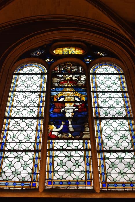 verrière de la chapelle Saint-Joseph : L'Enfant Jésus entre la Vierge et sainte Anne, un évêque, têtes de chérubins