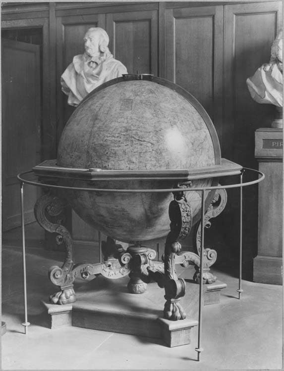Globe céleste, par Marc-Vincent Coronelli (1650-1718), fait par Gattlier, à Paris en 1694 ; monture de l'époque en chêne sculpté avec figures de cariatides féminines.