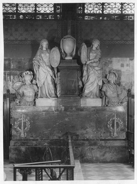 Inscription (latin), date : D.O.M. QUISQUIS HIC SISTIS NON MINUS RELIGIONIS ET PIETATIS QUAM VIRTUTIS BELLICAE MONUMENTUM VIDES QUODA ANANTISSIMUS SUIS PARENTI ET FRATRI OLIVARIO & LUDOVICO DE CASTELLAN CAROLUS ABBE TESTAMENTIO F. C. QUORUM ALTER PRO REGE ET PATRIA ALTER ETIAM IN CHRISTI CAUSA GLORIOSE OCCUBUIT QUIPPE OLIVARIUS NOBILISSIMUM EQUEM POST PRAECIPUS MITIAE SUB LUDOVICO JUSTO PRAELUDIA DUPLICIS COHORTIA DEIN SCIMUS IN CASTRIS CELERUM EQUITUM TRANS ALPES PRAZFECTUS ITALICE IN BELLO FACTIS ILLUSTRIS DOMUM IN CATALINICO DUCIS OFFICIUM ATRENUE AGENS AD TARACONEM INFESTA PILA TRAJECTUS INTERIIT ANNO FALUTIS M.DC.XLIV (gravée dans le cadre du soubassement). Inscription (latin), date : ...OFFICIIS MAXIME IN TURGAS INSIGNIS LUDOVICUS OLIVARII FILIUS EODEM ARDORE A TENERIS MILES PARI CONDITIONE DUX PRIMO UNI PRACTORISE COHORTI PRAEFECTUS TUM IPSIUS LEGIONIS MAJOR TANDEM PEDESTRIUM COPIARUM QUAS LUDOVICUS MAGNUS IN CRETAE SUBSIDIUM MISIT TRIBUNUS ERUPTIONE IN OTTOMANES FACTA FERALI GLOBULO EXTINCTUS EST CAROLUS OLIVARII ITEM FILIUS S APRI ET SILVAE MAJORIS ABBAS EORUM IN MEMORIAM HAEC MARMORI INSCRIBI CURAVIT ET IN ISTO MAUSOLEO A SE ERECTO SUB QUO IPSE JACET CORDA OPTIMI PARENTIS AC FRATRIS INCLUDI PRAECIPIT MORTUUS DIE 28 NOVEMBRIS AN.M.DC.LXXVII HIS CORPUS SUUM ADJUNGI OPTAVIT FRANCISCUS CAROLI FRATRUELIS ATQUE EX ASSE HAERES ET ITSE MILITARIBUS PRO REGE OFFICIIS MAXIME IN TURCAS INSIGNIS QUI OBIIT 8 JAN M.DC.LXXXIII (gravée dans le cadre du soubassement).