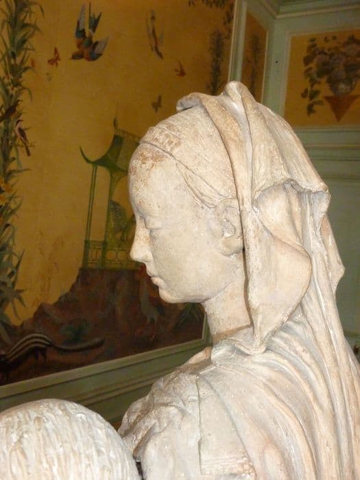 Traces de la polychromie originelle sur le bras gauche de la Vierge et sur sa chevelure.