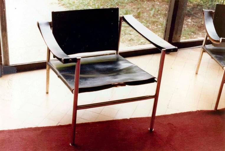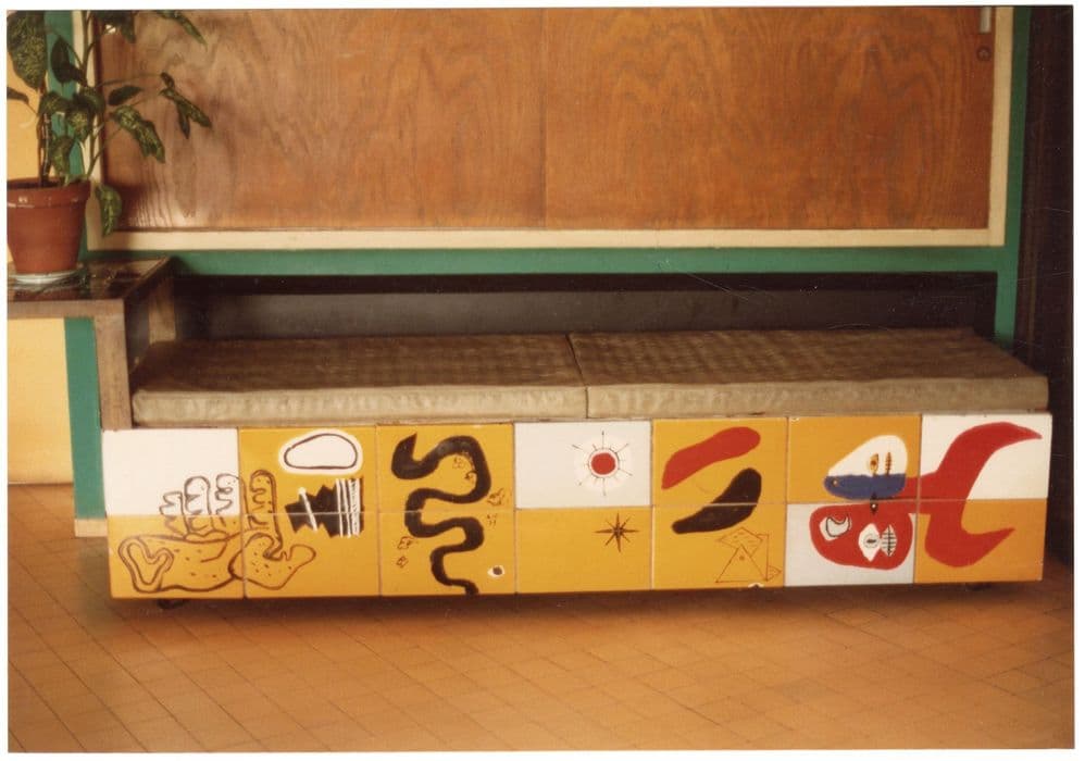 Banquette à laquelle s'attache une petite table (fonctions combinées), bois, fer, revêtement en plaques de céramique, et 10 fauteuils, aluminium et cuir.
