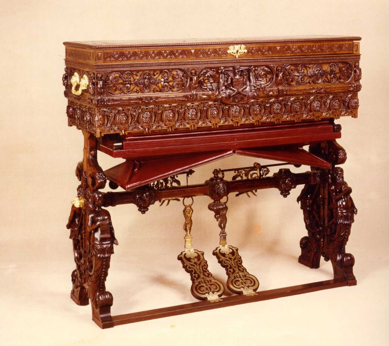 Harmonium guide-chant pliant. Il est en palissandre sculpté et marqueté de cuivre, d'étain et de nacre à décor de style Renaissance. Les pédales sont soignées et démontables. Le couvercle comporte le profil des musiciens suivants : Rossini, Donizetti, Mehul, Mandelsonn, Cherubini, Palestrina, Meyerbeer, Mercadante. Son étendue est de 5 octaves : UT 1 et UT 6.