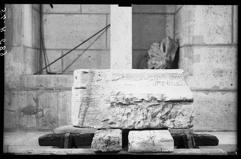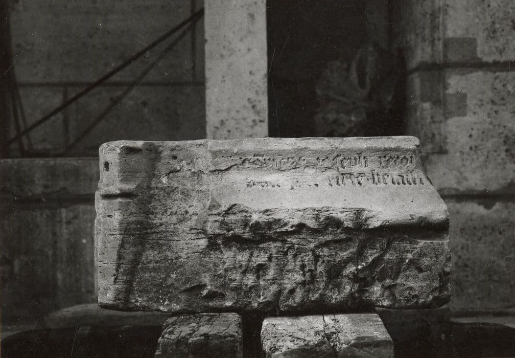 Fragments provenant de la partie tournante du choeur avec inscription ayant trait au patriarche Joseph, base moulurée de la clôture du choeur. Socle VIII, n°78.