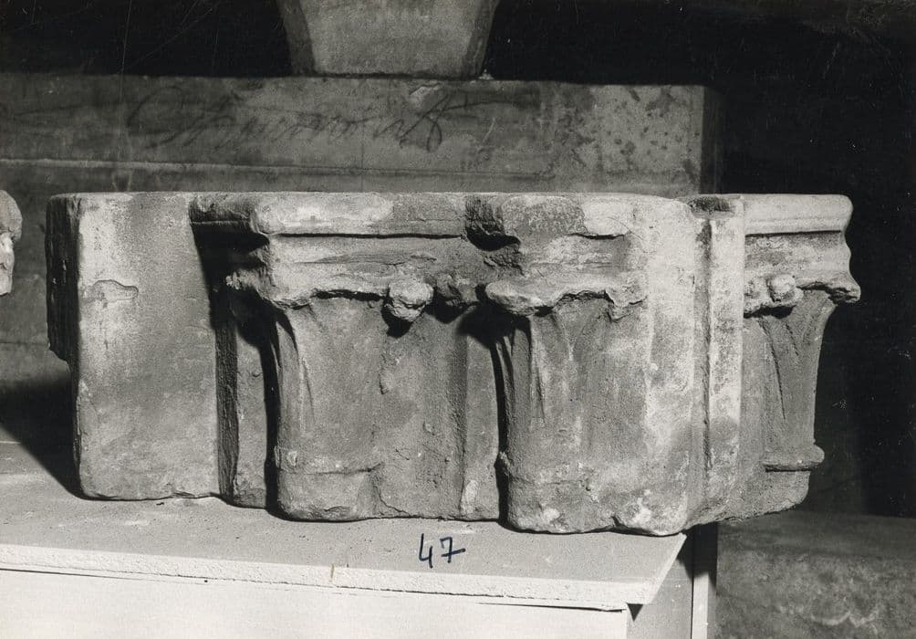 Fragment d'architecture : 3 chapiteaux engagés à décor de crochets sculptés dans un élément d'angle. Socle IV, n°47.
