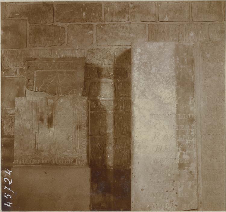 Dalle funéraire à effigie gravée. Sous une arcade trilobée, figure d'une religieuse debout, la crosse à la main. Il ne reste plus que deux fragments de cette dalle, qui avait été brisée pour faire des marches devant le maître-autel. L'inscription de la bordure est en caractères gothiques.