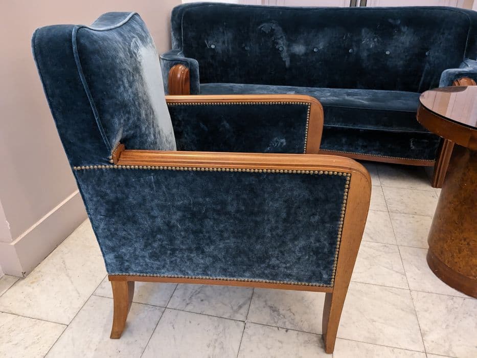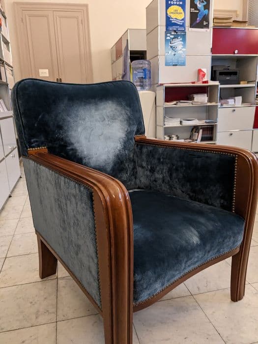 Inventaire 80.M.24. Velours bleu / vert. Assortis au canapé (PM75003210), à la table ronde (PM75003212) et à l’armoire (PM75003235).