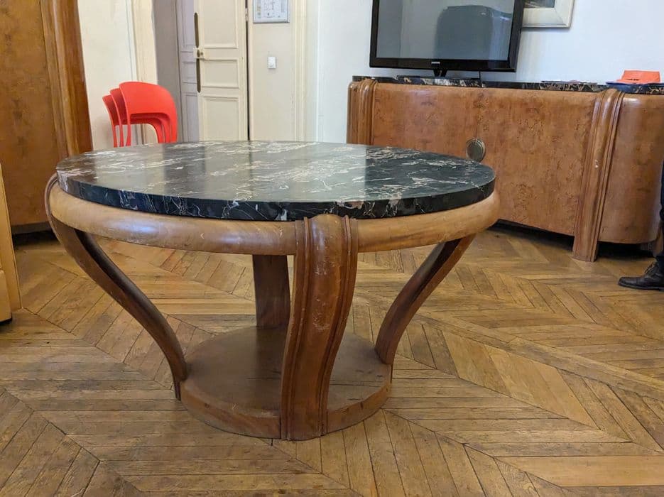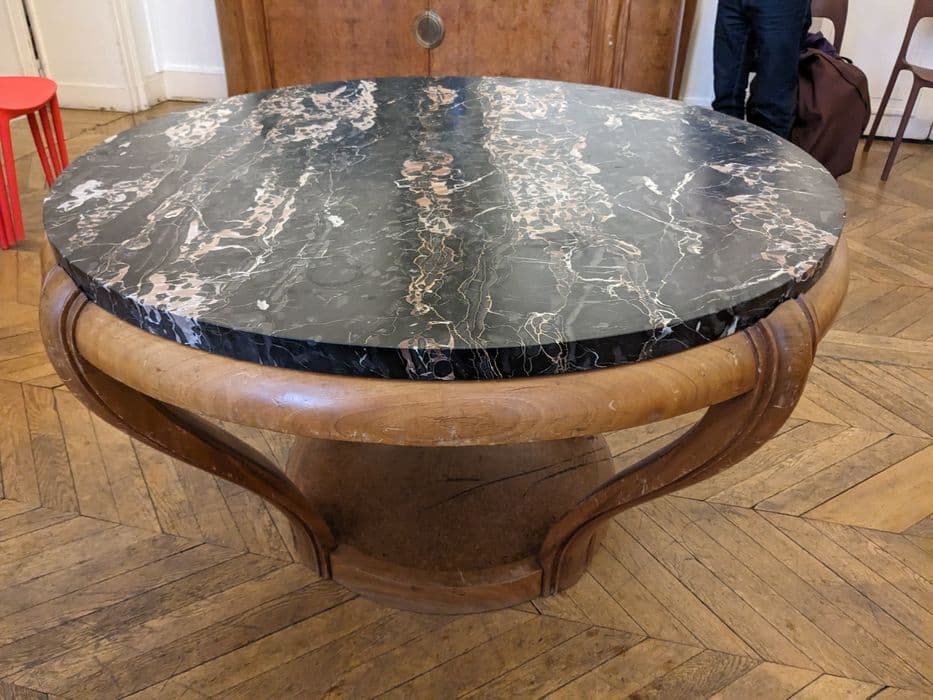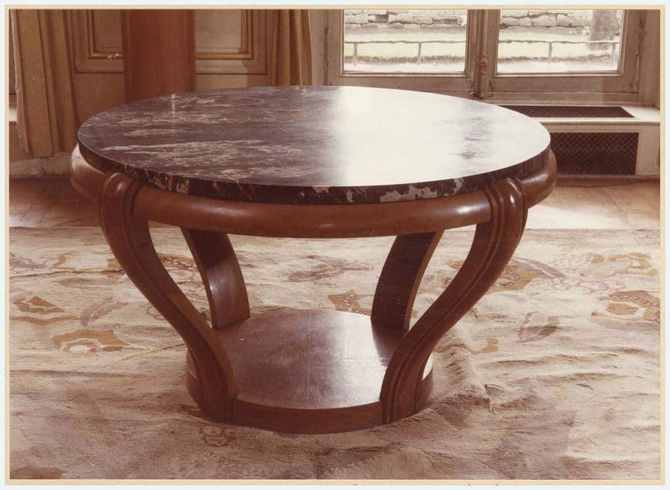 Inventaire 80.M.25. Loupe de thuya, dessus de marbre Portor (?). Assortie au canapé (PM75003210), aux deux fauteuils (PM75003211) et à l’armoire (PM75003235).
