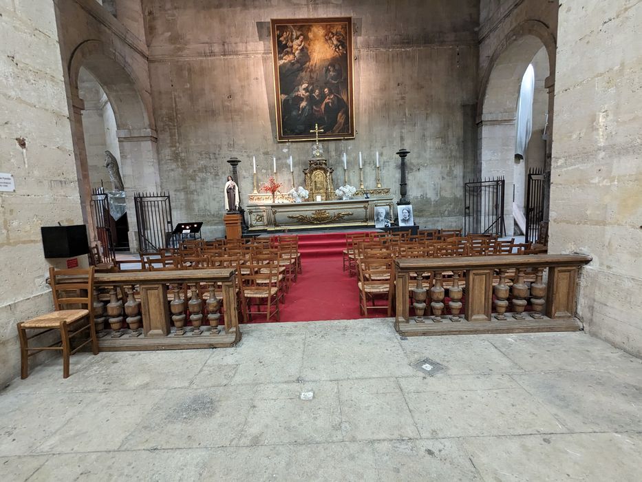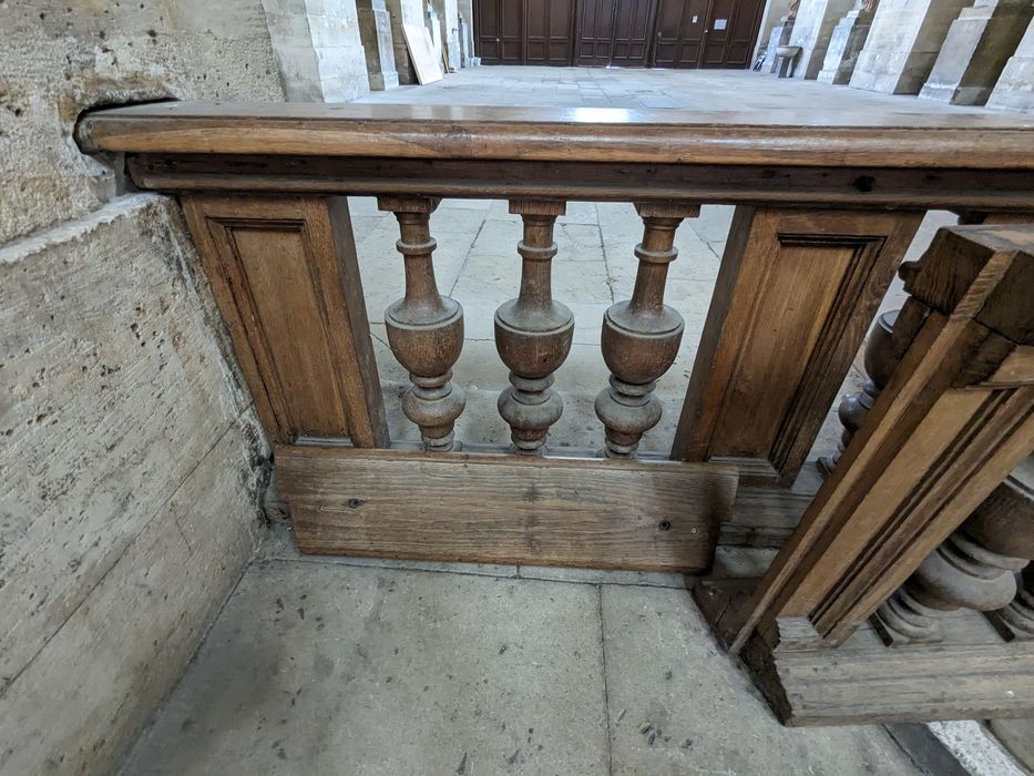 Balustrade de pourtour du choeur, anciennement table de communion. Ferrures : pivots, verrous. Disposition première : quatre sections avec deux battants entre deux parties dormantes aux débouchés des trois nefs et du chevet ; quatre sections dormantes d'un seul tenant aux débouchés des quatre chapelles.