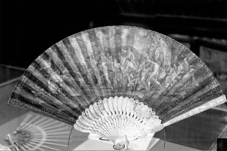 Eventail composé de 20 brins (et deux panaches) et feuille pliée, ivoire, applications de nacre, vélin et gouache. Montage dit à l'anglaise (vélin d'un seul tenant).