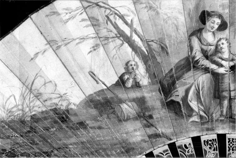 Eventail composé de 16 brins (et deux panaches) et feuille pliée, ivoire, vélin, gouache (et aquarelle ?). Montage à l'anglaise (vélin d'un seul tenant).