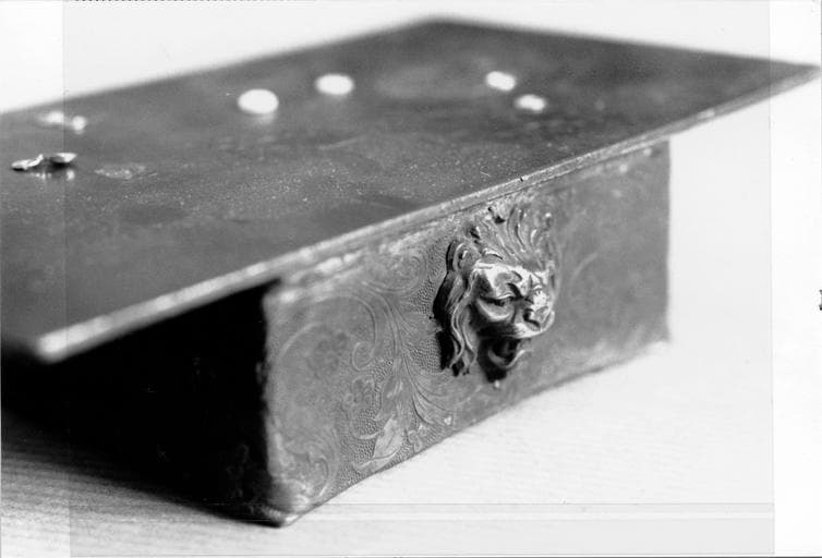 Ce tas à river sert de support pour la rivure. Il permet, avec un marteau, d'écraser la pointe affleurant du clou lors de l'assemblage des brins et panaches. Le plateau est en laiton au plomb (?), et le piètement est en laiton au plomb avec une patine bronze, avec des motifs estampés ; les ornements en applique du piètement sont en bronze.