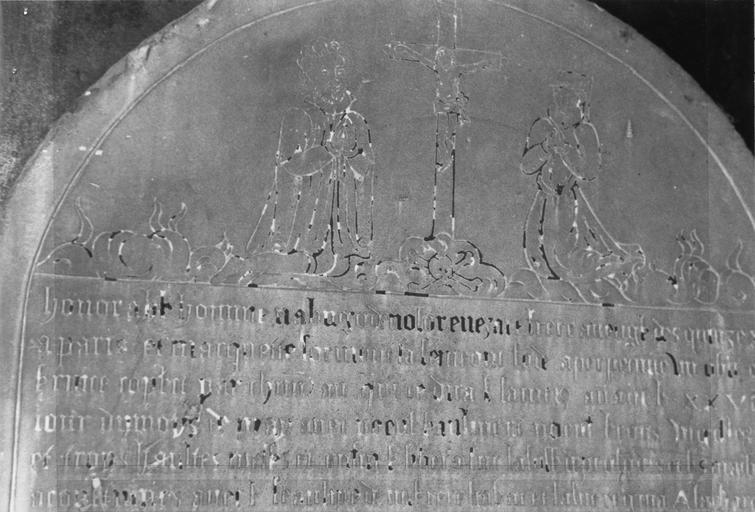 Plaque rectangulaire au sommet en arc de cercle, en calcaire beige gravé.