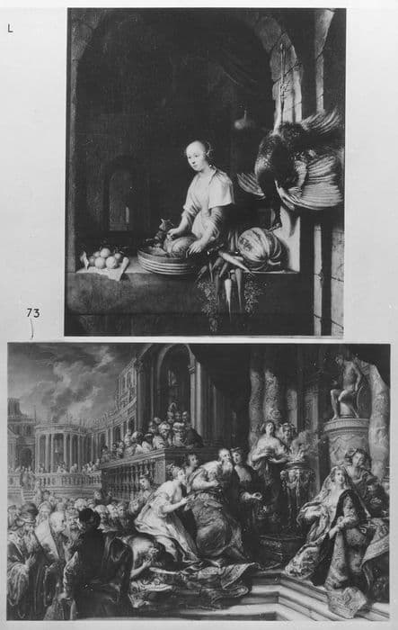tableau : Scène d'intérieur, une femme auprès d'un établement de victuailles et son cadre