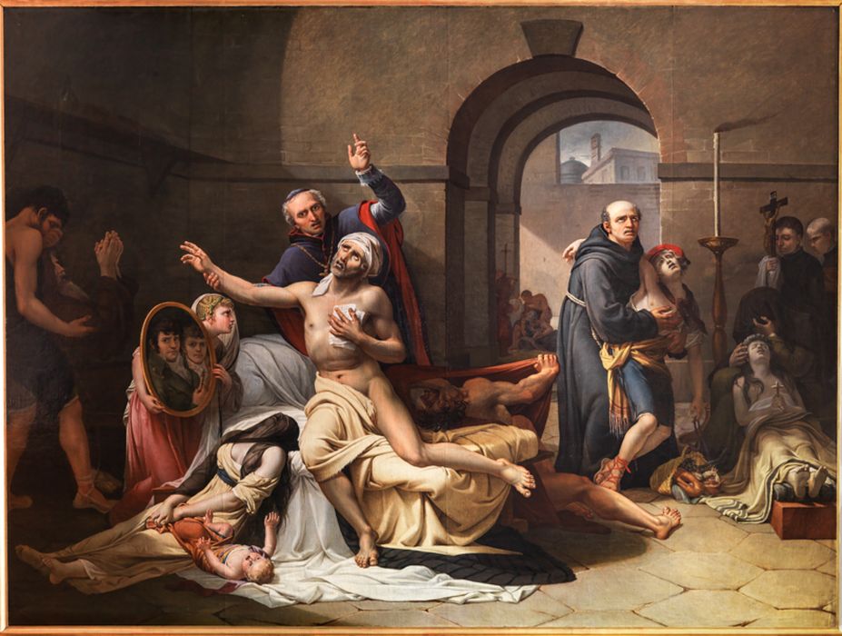 Don Charles André de Manneville (1823-1902) et Marie-Félicité née Benoist (1840-….), vicomte et vicomtesse de Manneville, 1870. Selon la conservatrice des antiquités et objets d'art, le titre du tableau serait : Épidémie d'Espagne, la fièvre jaune à Valence (bordereau de récolement 2021).