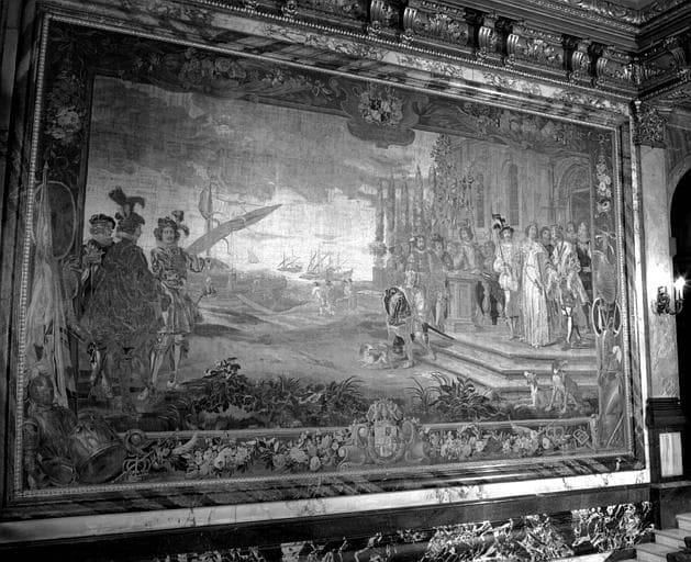 tenture de l'histoire de Moncade : Le pieux roi Martin, regagnant l'Espagne, confie à Moncade la tutelle de son fils et du royaume (pièce murale 4)