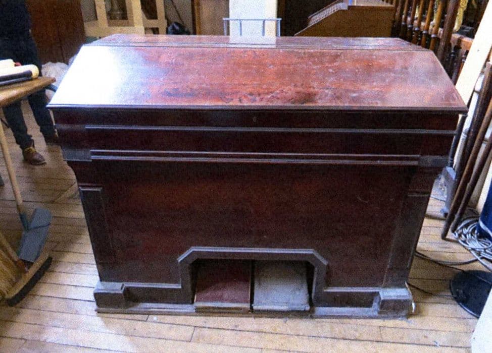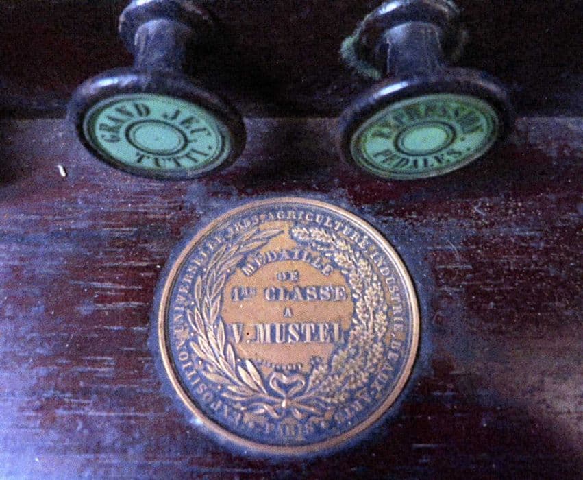 Instrument classique de « 5 jeux », Jeux de 8 pieds, nécessaires au soutien de la voix, 4 demi-jeux dans les basses, 6 demi-jeux dans les dessus, deux jeux de Basson Hautbois et l'absence d'un jeu de 4 pieds. Caisse en palissandre est de forme pupitre, avec un couvercle articulé en trois parties. La table des layes est réalisée par un assemblage complexe d'ébénisterie. Mécanismes de commande et d'ouverture des soupapes de jeux. Dans la case du Basson, mécanisme du pianissimo pneumatique, sorte de double-expression simplifiée avec soupape d'introduction assujettie à un moteur atmosphérique régulateur, affectée à ce seul demi-jeu et agissant en sourdine.