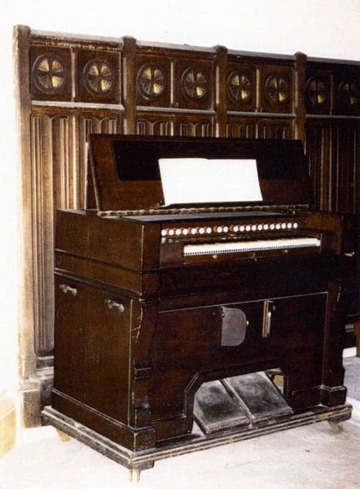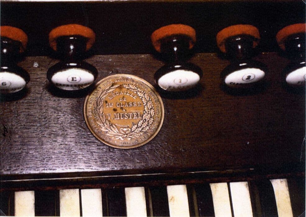 L’harmonium possède 7 jeux 1/2 réels, soit 6 jeux dans les basses et 9 dans les dessus, un clavier transpositeur à crémaillère. Sa caisse en chêne est de forme carrée, avec un couvercle articulé en trois parties. Elle est de style Louis-Philippe, de dimensions supérieures à la moyenne compte-tenu de l’importance du sommier de l’instrument. La table des layes est réalisée par un assemblage complexe d’ébénisterie. Dans la case du Basson est un rare mécanisme du pianissimo pneumatique, double-expression simplifiée avec soupape d’introduction assujettie à un moteur atmosphérique régulateur affecté à ce seul demi-jeu et agissant en sourdine. Au sommier, disposition des anches dans un alignement différent de celles des touches.