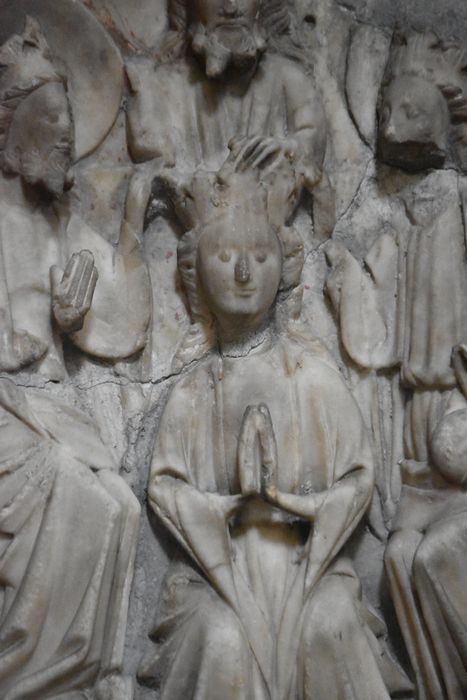 Haut-relief représentant le Couronnement de la Vierge, n° Inv. COARC : COA-LIL89/704. Réalisé en albâtre et comportant des traces de polychromie. Il a été coulé dans le ciment.