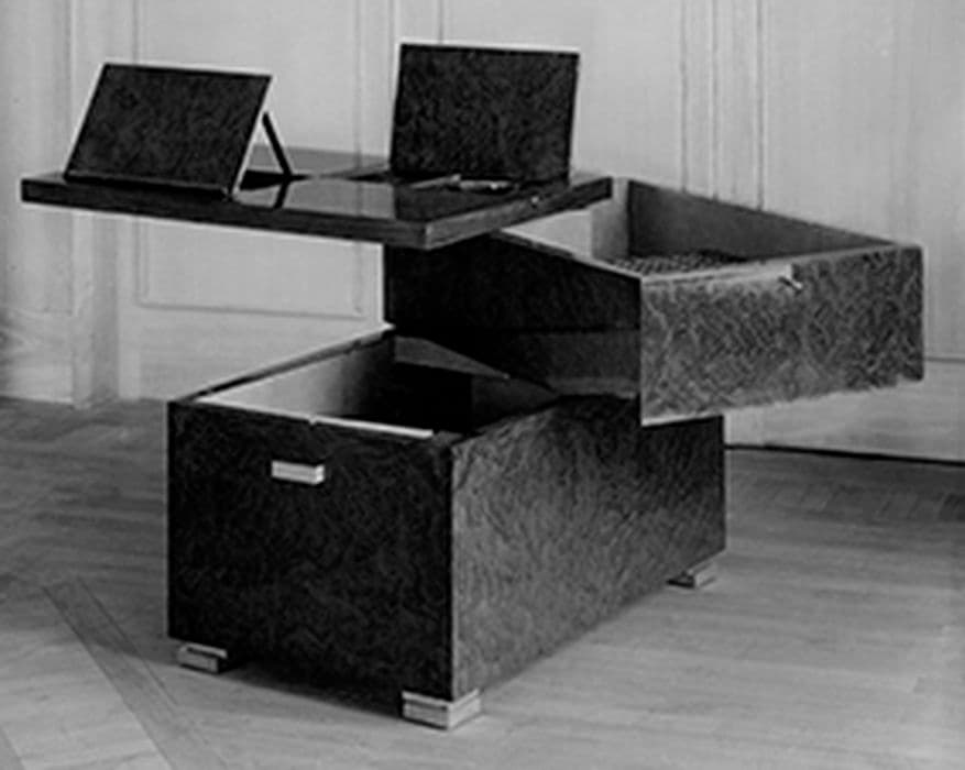 Meuble de chevet pivvotant, acajou, thuya, loupe de thuya, galuchat, acier nichelé.