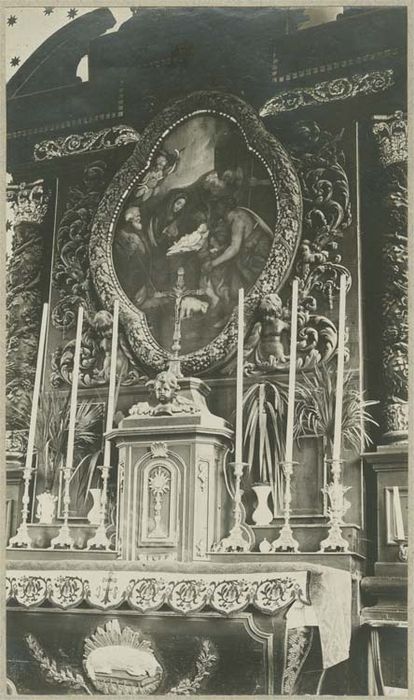 Jésus couché sur une paillasse est entouré par la Vierge, saint Joseph, un berger tenant un bâton et des rois mages ; un ange domine la scène ; au second plan : étable et fond paysage