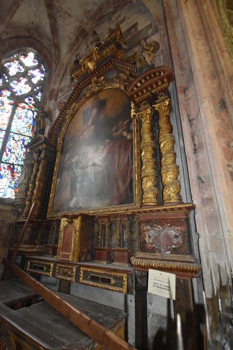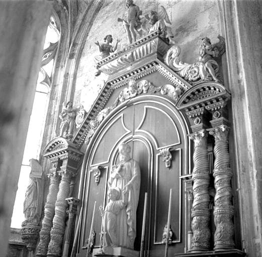 le retable est composé d'une prédelle peinte faux marbre avec cartouche, sur laquelle repose deux colonnes corinthiennes torsadés ; ces colonnes sont terminées par des demi frontons d'où partent des anges ; la toile se trouve dans la partie centrale du retable ; le tympan est décoré de frise, de feuillage, ; de volutes et d'un mascaron ; la corniche est ornée d'un noeud de ruban, de godrons et d'un cartouche ; au sommet le Christ est représenté les bras ouverts avec un ange de chaque côté