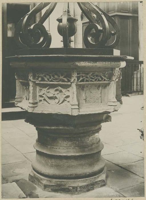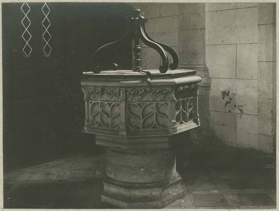 cuve octogonale, chaque pan est décoré de fenestrages flamboyants sous une frise de feuillages et séparé des autres par un clocheton