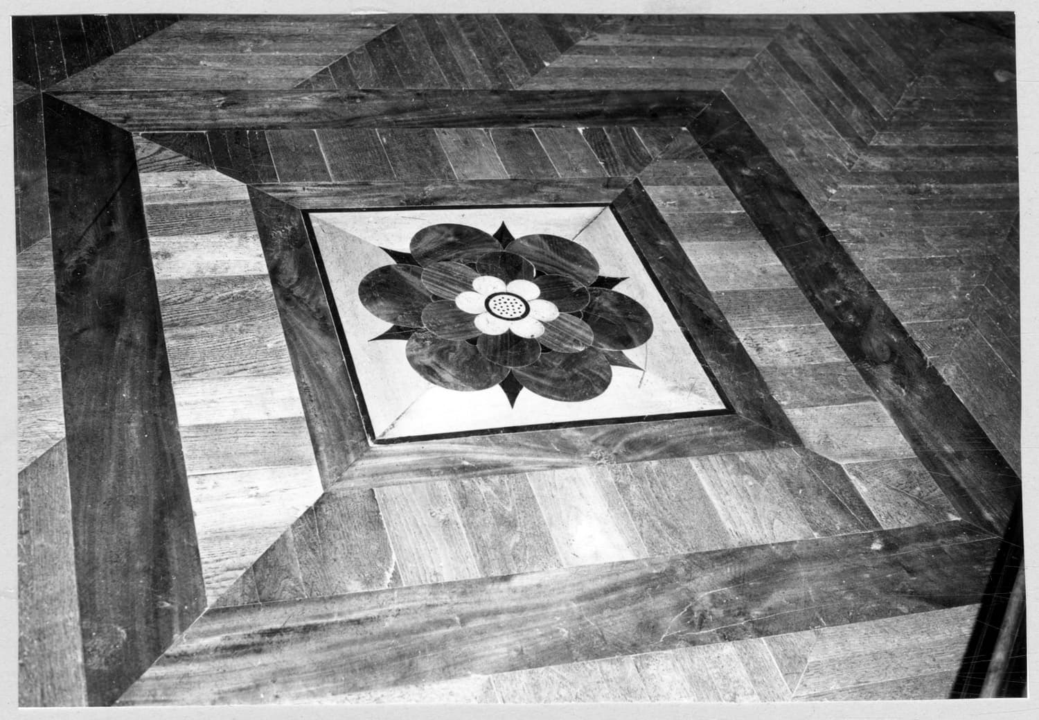 décor de la chambre des évêques (porte, cache-radiateur, serrure, cheminée, plafond, tentures murales, tableau, parquet)