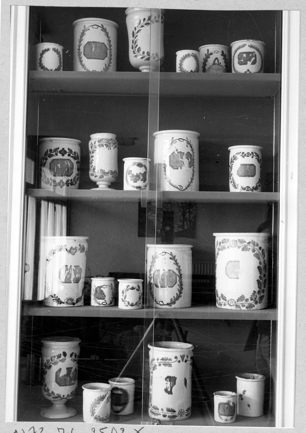 différents pots à pharmacie avec ou sans pied, ornés de couronnes, de scènes
