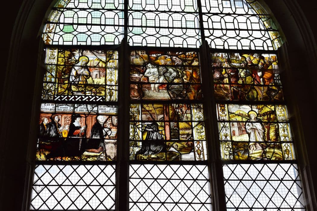 verrière composite, vitrerie géométrique, 2 reg. ? reg. inf. à gauche/les donateurs, au centre et à droite du reg. inf., à gauche du reg. sup. : éléments d'un calvaire, partie inf. de la Croix, saint Jean, la Vierge, reg. sup., à gauche : Suzanne et les vieillards, à droite, groupe de soldats ?
