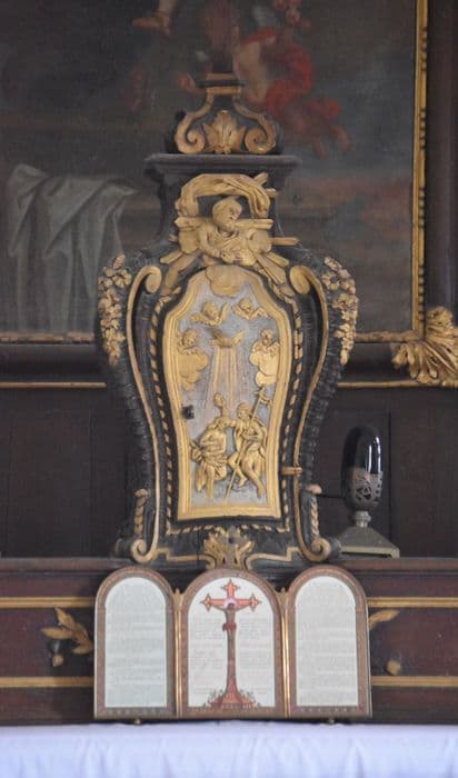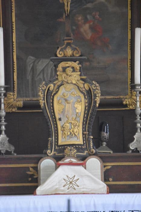 les coins sont décorés par des volutes ; représentation du Baptême du Christ sur la porte du tabernacle
