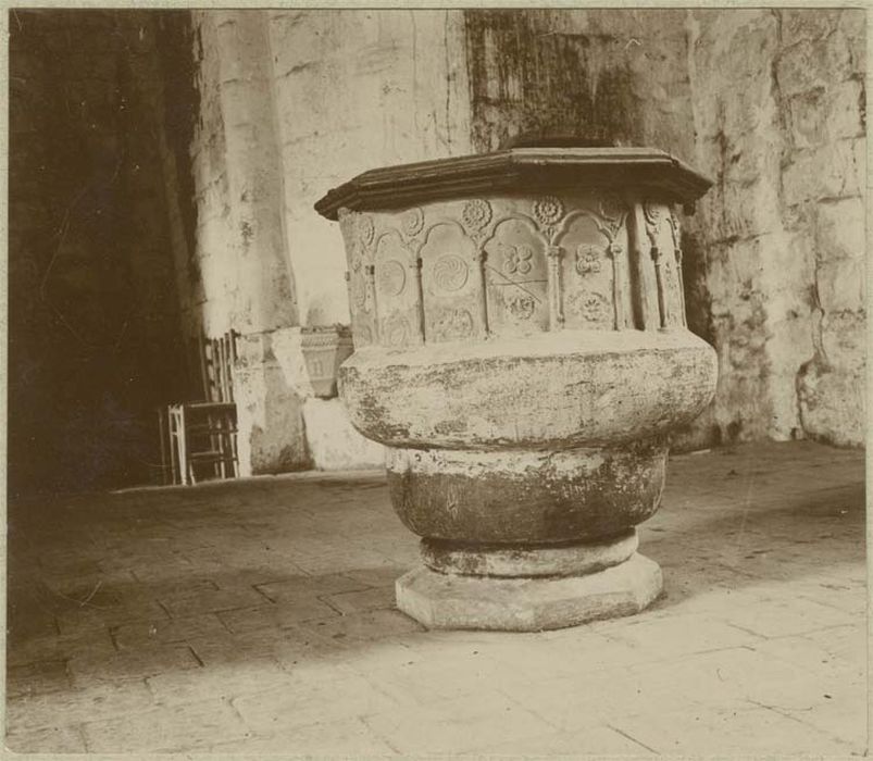 cuve circulaire de plomb décorée par des arcatures trilobées et des rosaces, supportée par un piétement en pierre