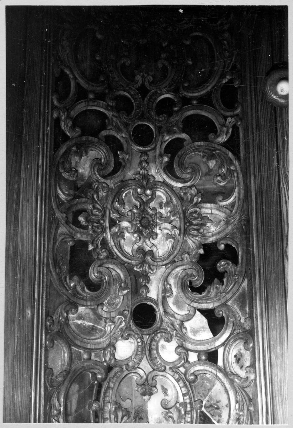 Ces boiseries comprennent, de part et d'autre de la porte d'entrée des grillages en bois séparant la chapelle d'une tribune et d'une fausse tribune, au dessus de l'autel se trouvent 7 têtes d'anges.