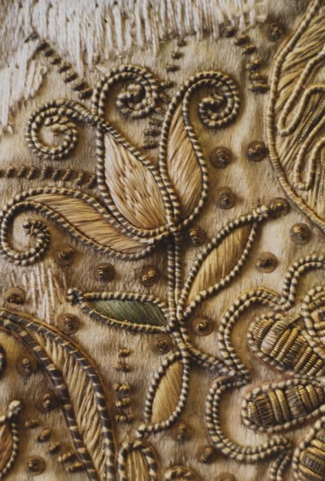 matériau textile : satin, brodé ; fil métal : doré, filigranes