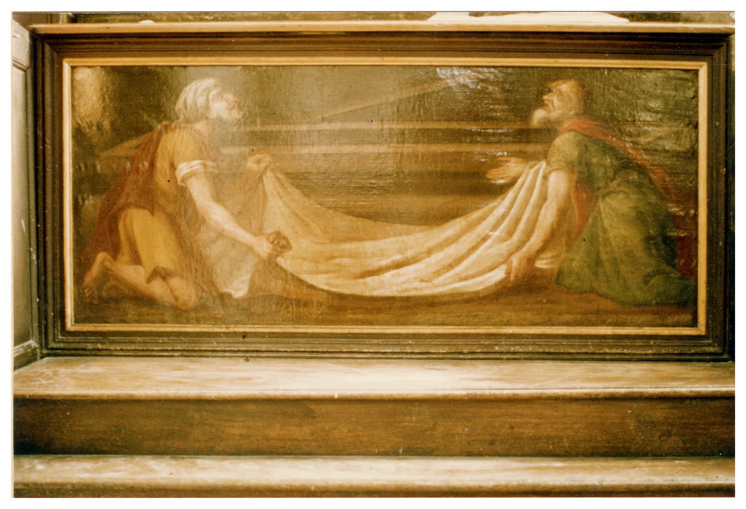 le retable comprend au dessus du tabernacle qui a perdu ses deux statues latérales, 2 pilastres de bois peint encadrant une toile qui représente la Descente de Croix et une inscription à volutes
