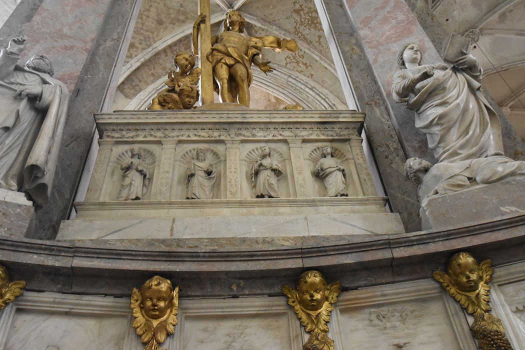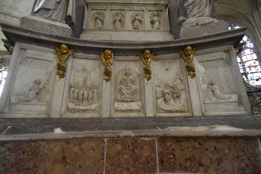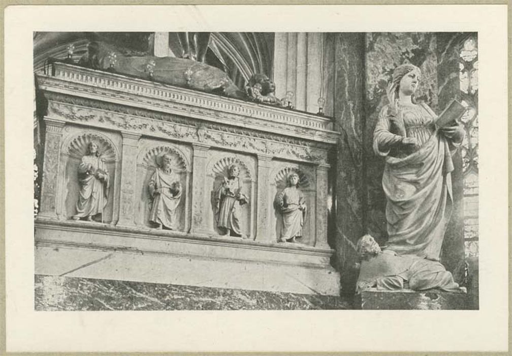 tombeau rectangulaire décoré sur ses côtés de figures d'apôtres en pied, sous des niches à coquilles qui surmontent une frise et un entablement