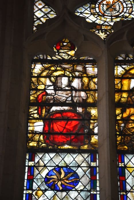 verrière à personnage : saint Pierre, le Christ bénissant, la Vierge, saint Jean ; fond architecturé ; dans le tympan : la Trinité