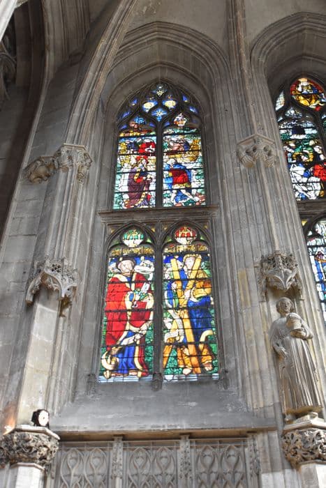 4 verrières de la chapelle Saint-Etienne : saint Pierre, saint André, saint Jacques et saint Jean, le Christ et saint Thomas
