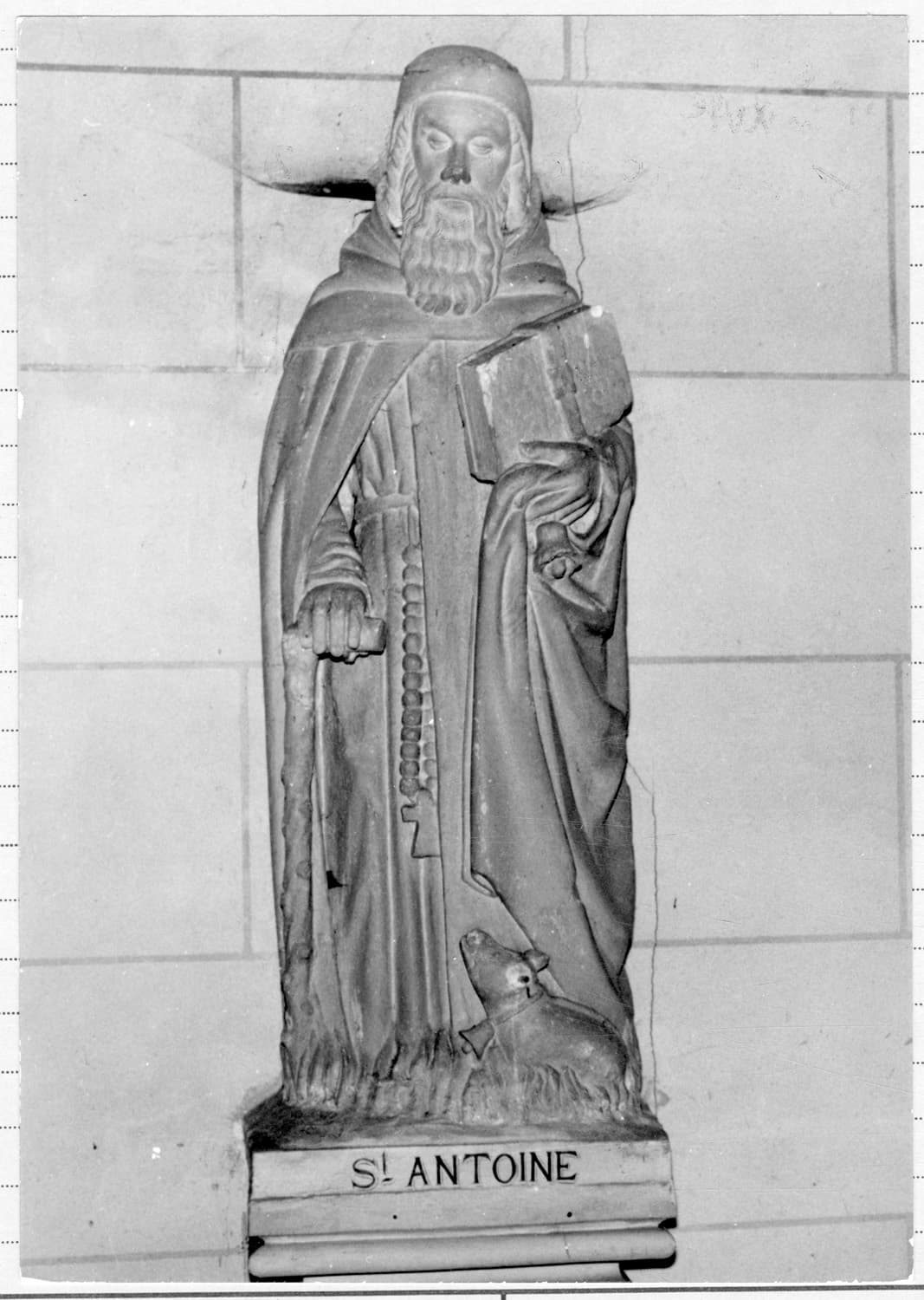 saint Antoine abbé ; en pied ; bâton ; portant ; livre ; porc
