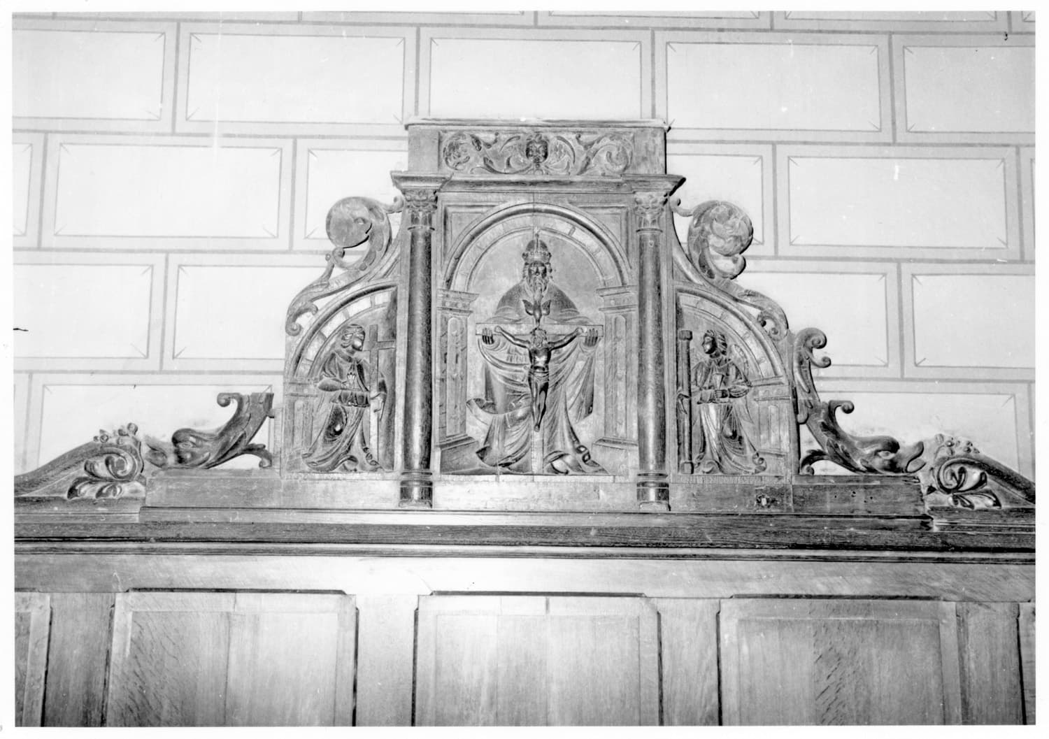 panneaux formant dossiers de bancs : La Trinité et deux anges