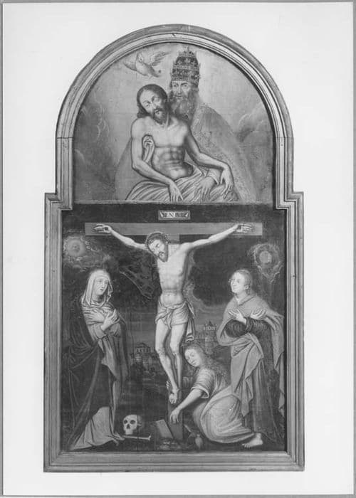 Crucifixion ; sainte Madeleine ; saint Jean l'Evangéliste ; Vierge de douleur ; Trinité