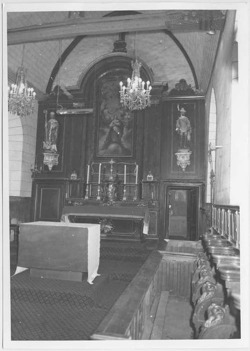 autel (maître-autel), retable, tabernacle, tableau : Assomption de la Vierge, deux statues : Saint Nicolas et Saint Hubert