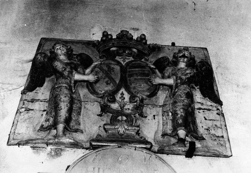 Pierre tombale surmontée d'un double blason encadré d'angelots.